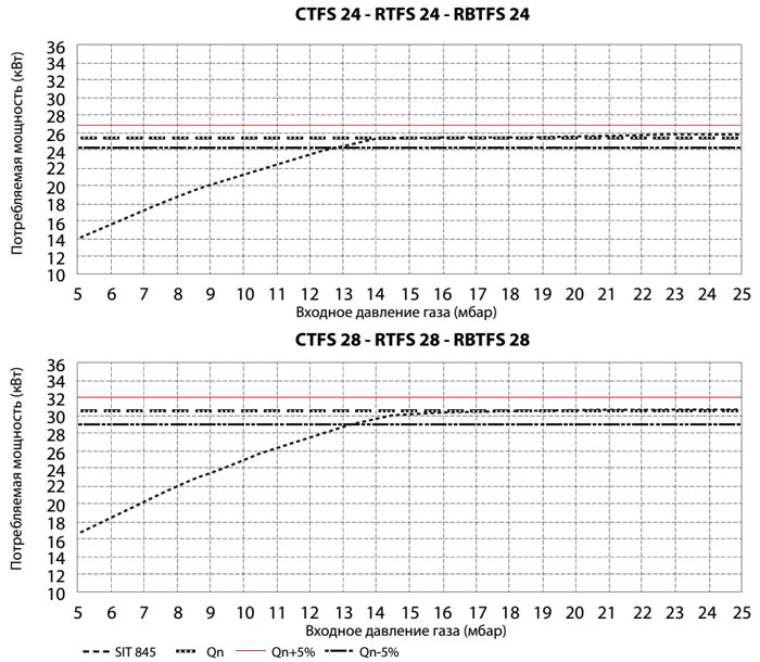 | Давление газа в горелке при номинальной мощности, бутан (G30) | мбар | 28,0 | 27,5 |