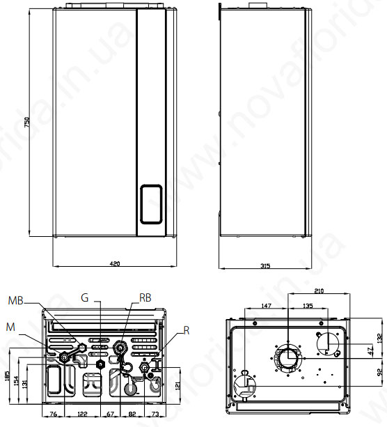 MB Подающая линия в бойлер G Подача газа RB Обратная линия из бойлера R Возврат из системы отопления |