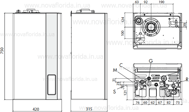 G — подача газа (½"), M — подача воды в систему отопления (¾″), C — выход ГВС (½"), F — подача холодной воды (½"), R — возврат из системы отопления (¾").