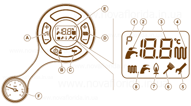 - Панель керування з дисплеєм дає змогу легко регулювати та контролювати температуру опалення, ГВС і режим роботи котла, а також переглядати коди блокування котла