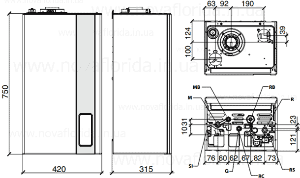 RB — зворотна лінія вторинного контуру з бойлера, G — вхід газу, SI — заглушка ревізії сифона, M — відповідна лінія системи опалення, RC — підпоживальний клапан, R — зворотна лінія системи опалення, RS — зливний кран, MB — лінія вторинного контуру бойлер